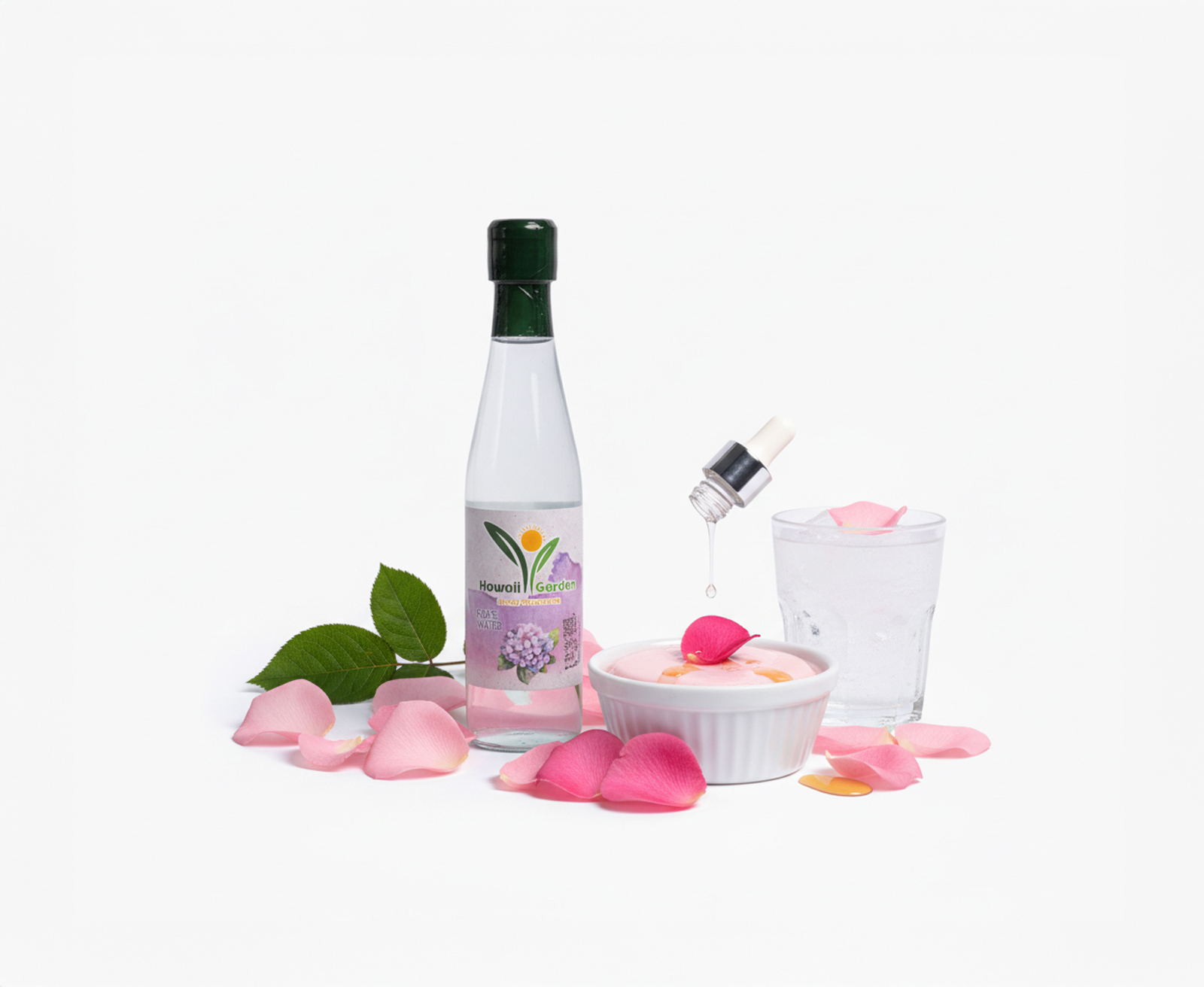 Steam-distilled rose water for desserts, drinks and skincare rituals. A few drops transform puddings and syrups.